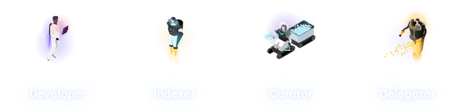 The Graph Network consists of Indexers, Curators and Delegators that provide services to the network, and serve data to Web3 applications. Consumers use the applications and consume the data.