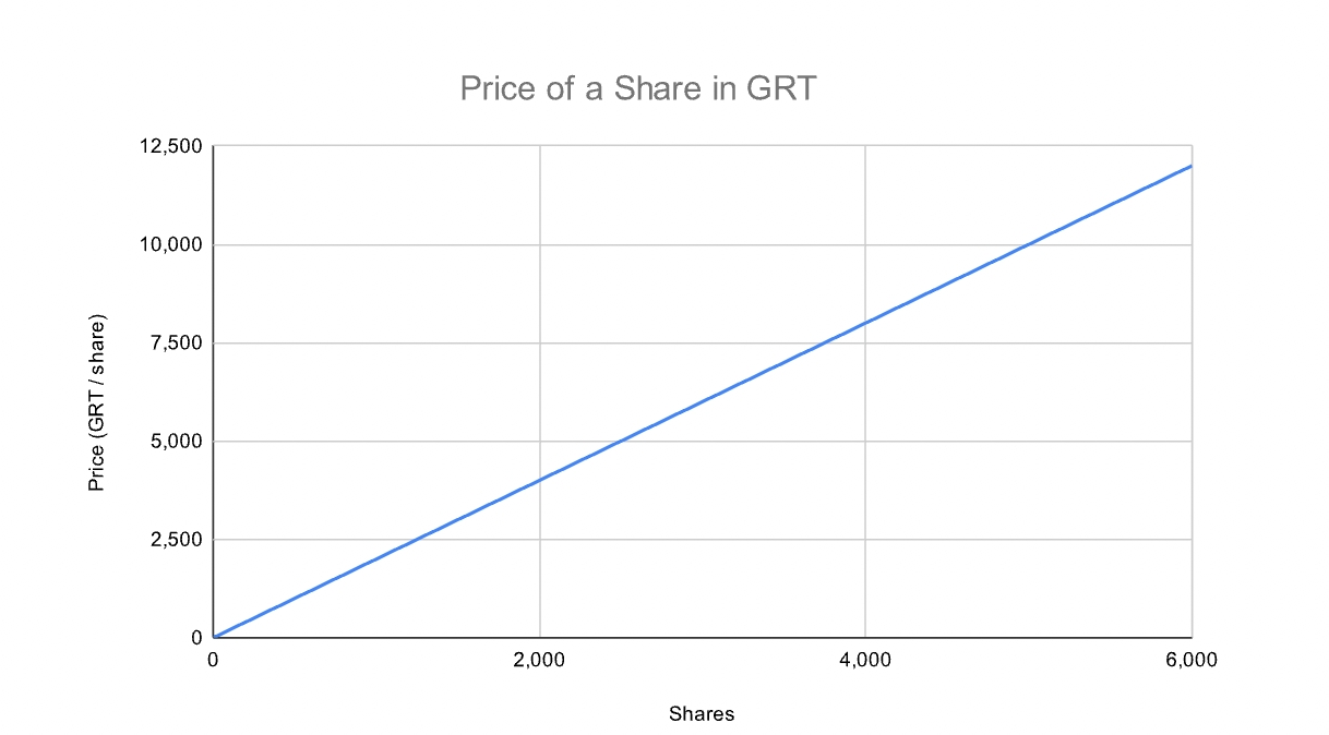 As a result, price increases linearly, meaning that it will get more expensive to purchase a share over time. Here’s an example of what we mean, see the bonding curve below: