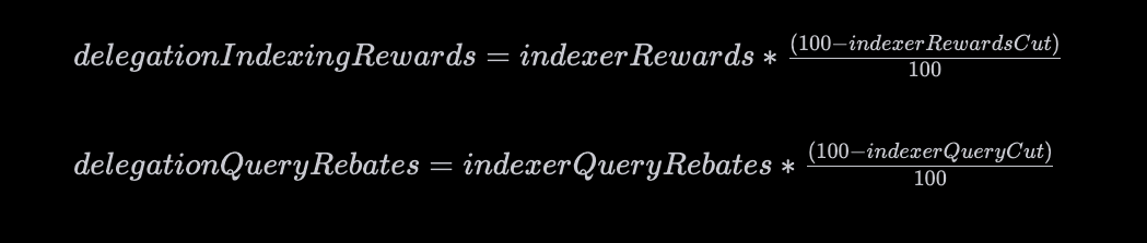 As described in the above sections, you should choose an Indexer that is transparent and honest about setting their Query Fee Cut and Indexing Fee Cuts. A Delegator should also look at the Parameters Cooldown time to see how much of a time buffer they have. After that is done, it is fairly simple to calculate the amount of rewards the Delegators are getting. The formula is: