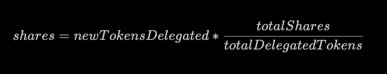 Another thing a Delegator has to consider is what proportion of the Delegation Pool they own. All delegation rewards are shared evenly, with a simple rebalancing of the pool determined by the amount the Delegator has deposited into the pool. This gives the Delegator a share of the pool: