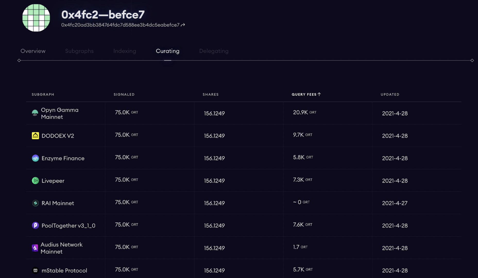 In the Curation tab, you’ll find all the subgraphs you’re signaling on (thus enabling you to receive query fees). Signaling allows Curators to highlight to Indexers which subgraphs are valuable and trustworthy, thus signaling that they need to be indexed on.