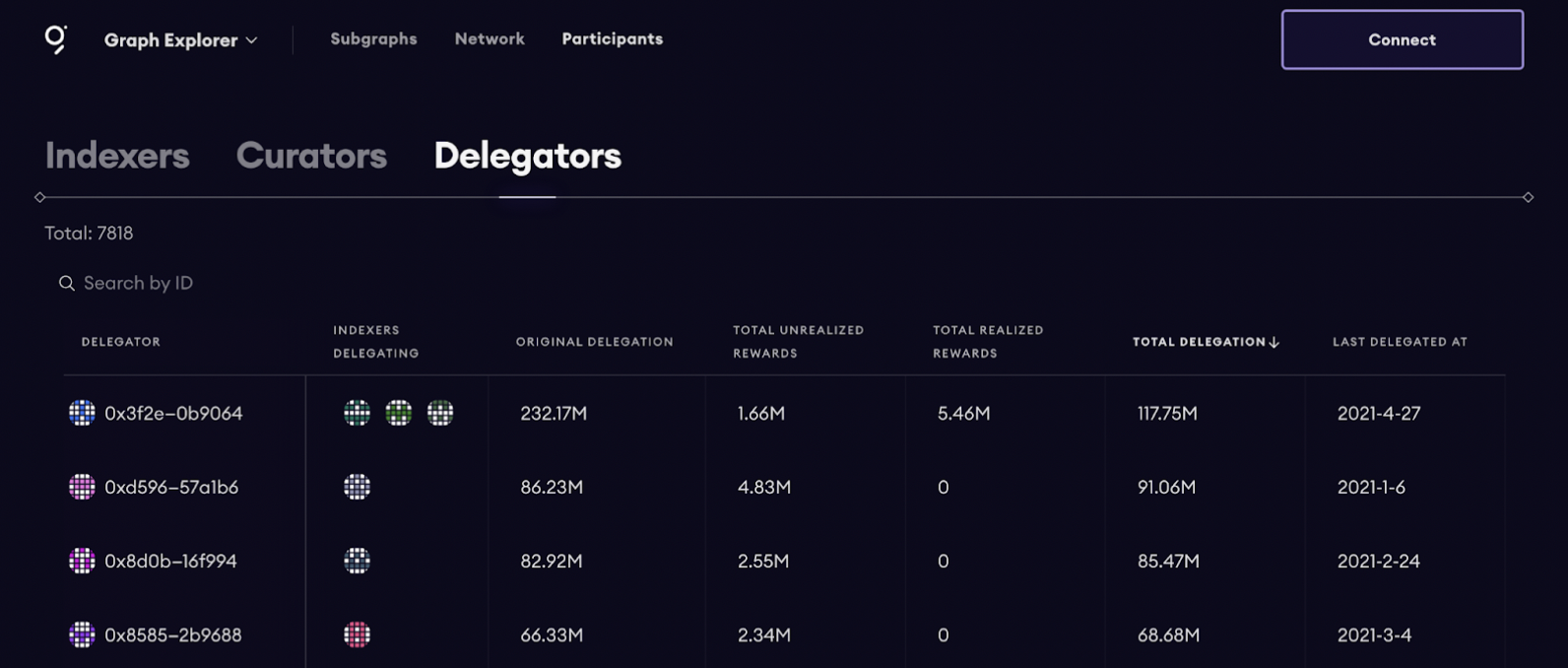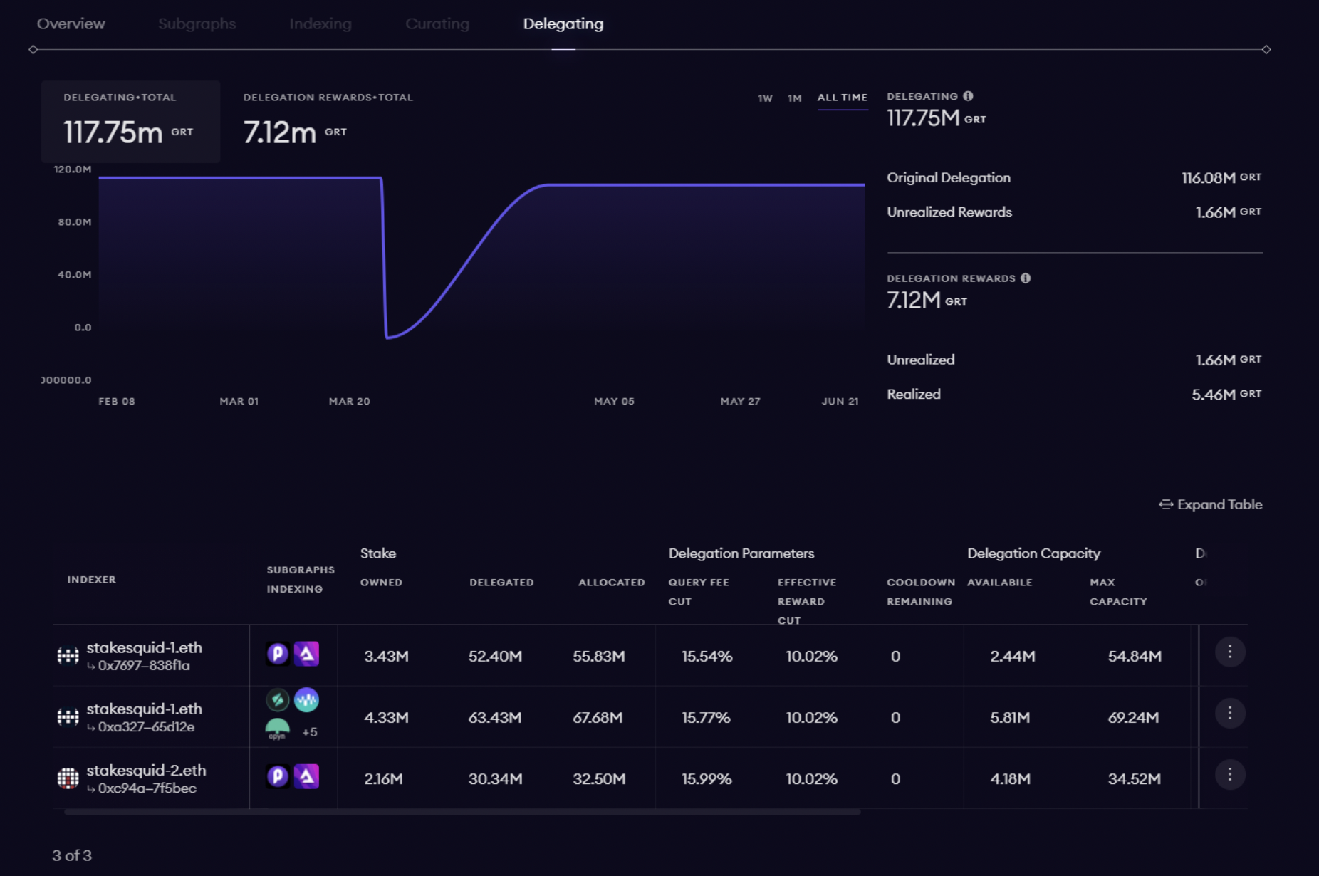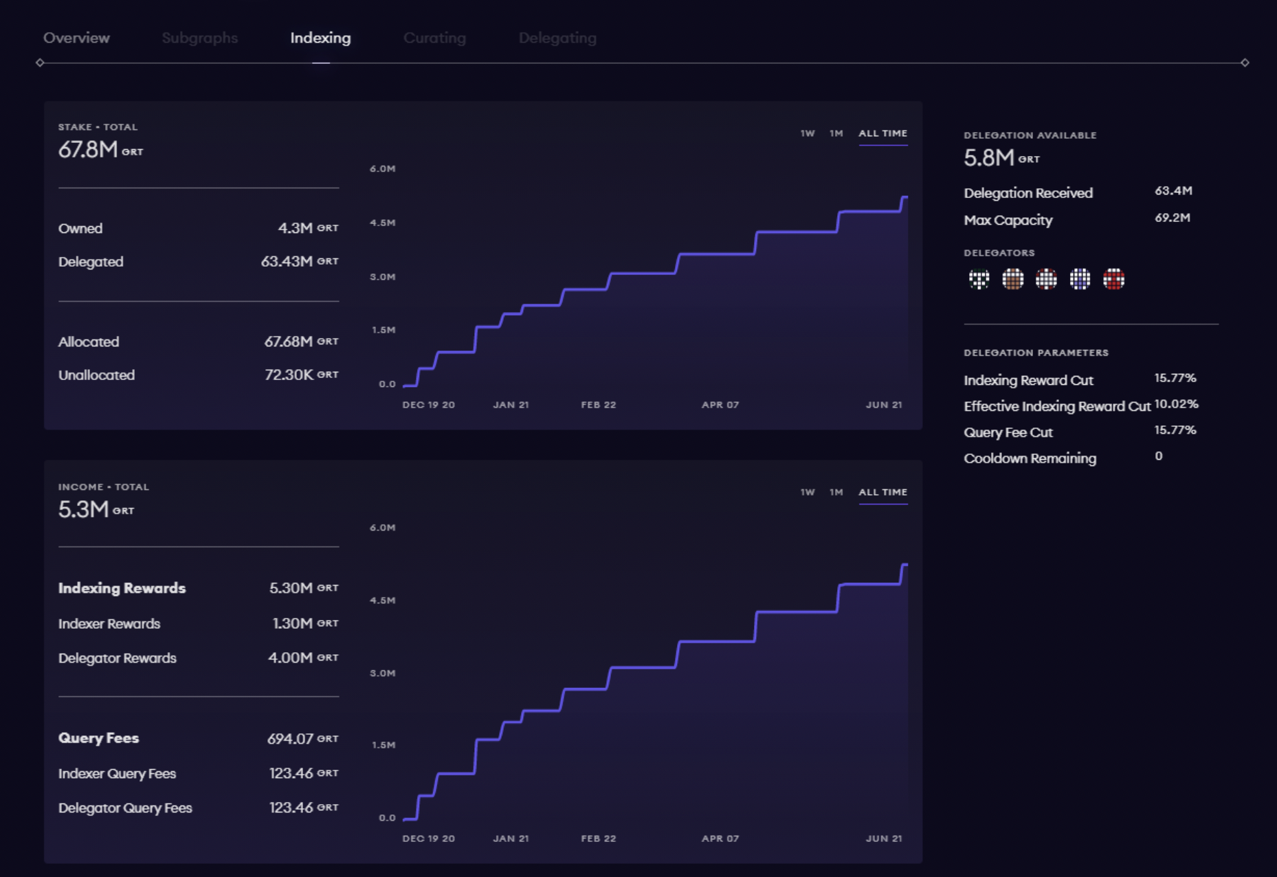 Delegators are important to the Graph Network. A Delegator must use their knowledge to choose an Indexer that will provide a healthy return on rewards. Here you can find details of your active and historical delegations, along with the metrics of the Indexers that you delegated towards.