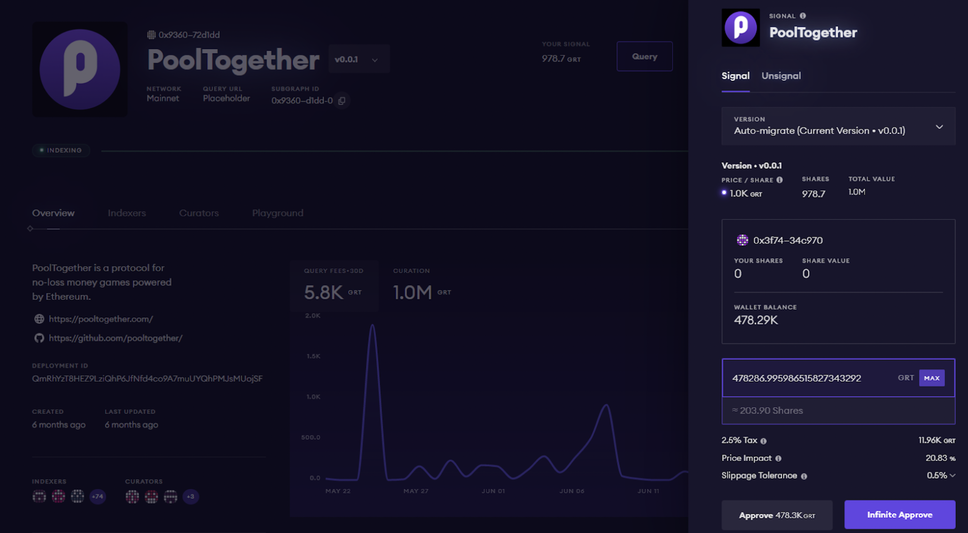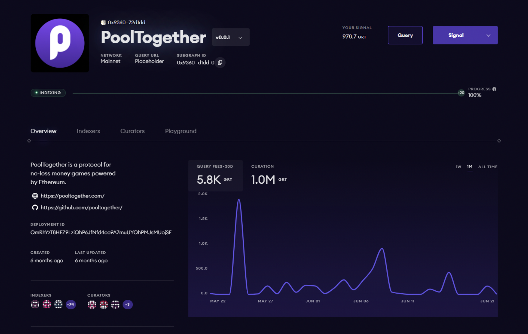When you click into a subgraph, you’ll be able to test queries in the playground and be able to leverage network details to make informed decisions. You’ll also be able to signal GRT on your own subgraph or the subgraphs of others to make indexers aware of its importance and quality. This is critical because signaling on a subgraph incentivizes it to be indexed, which means that it’ll surface on the network to eventually serve queries.